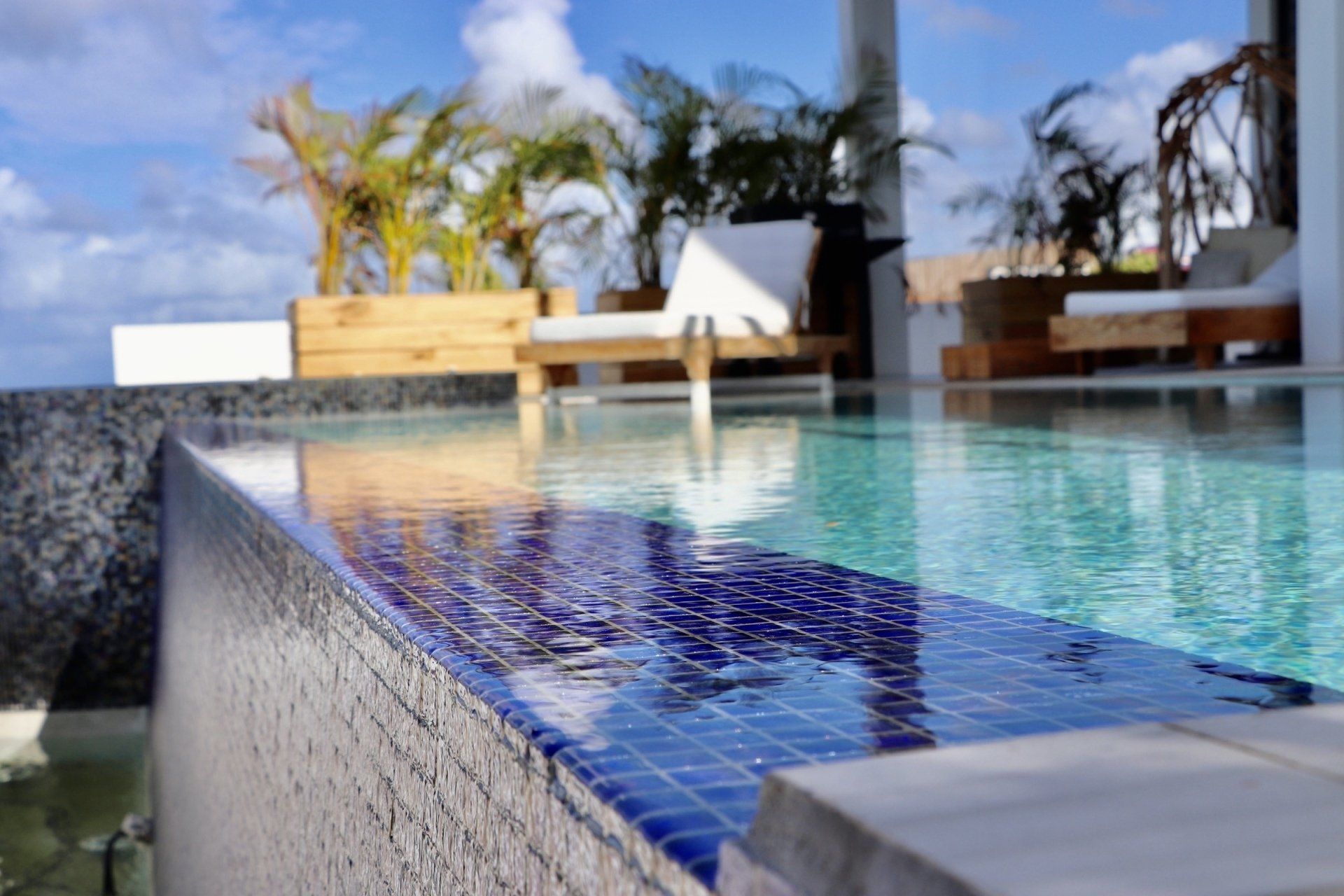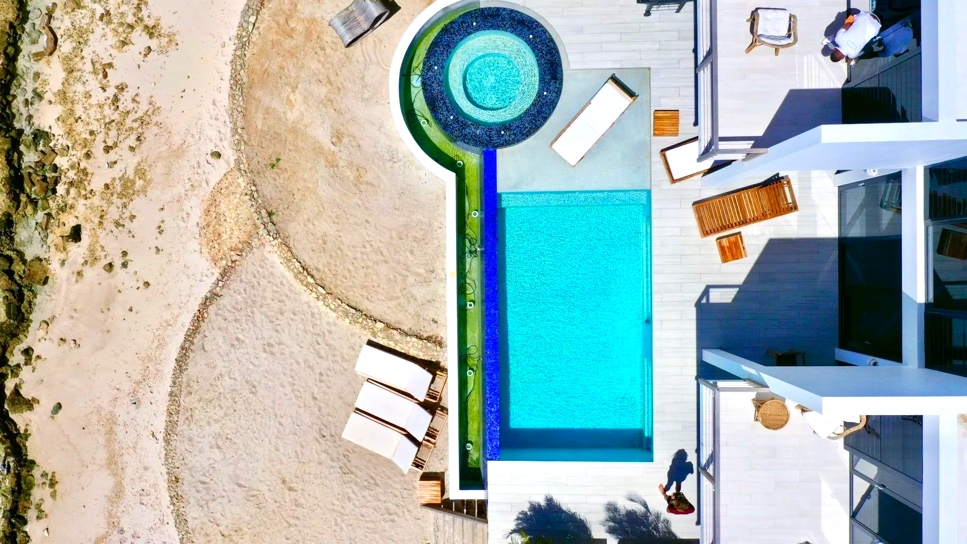 The luxurious, custom made pool and spa come with a beautiful blue tile and underwater windows that match the modern design of the villa.